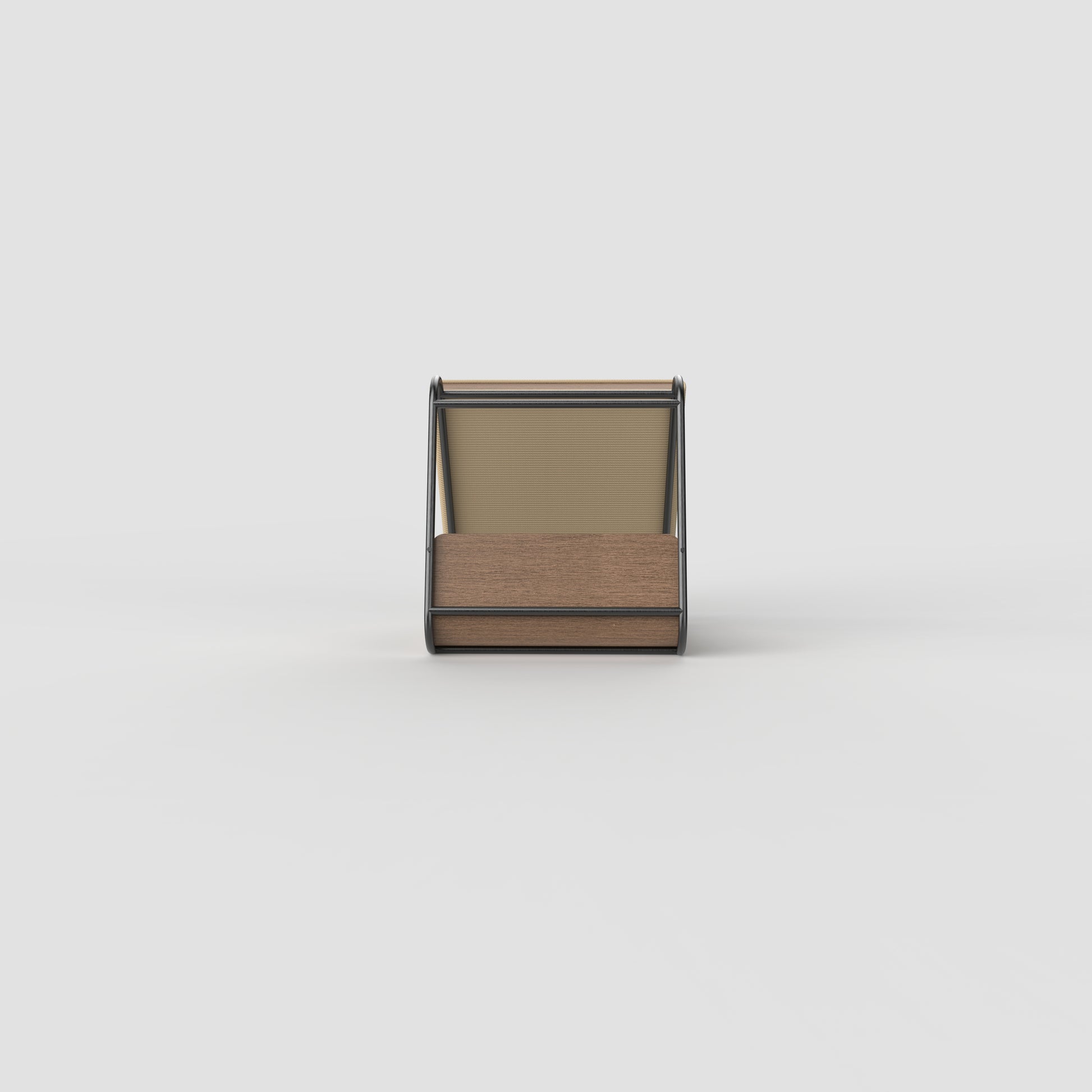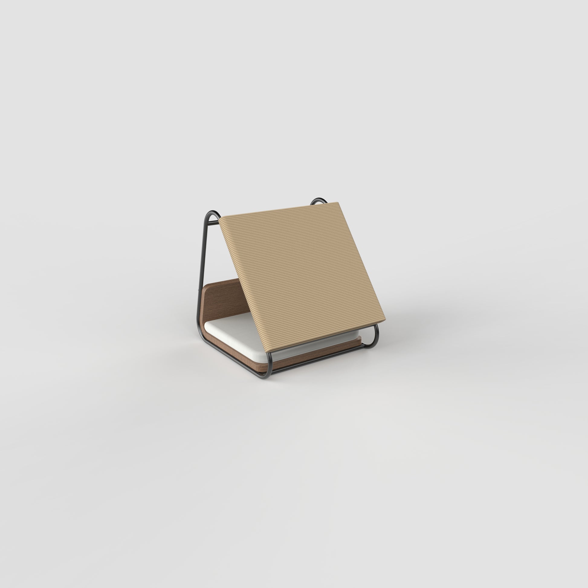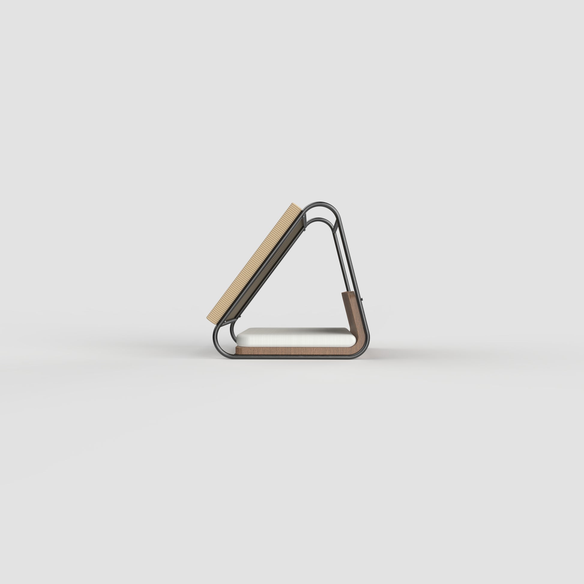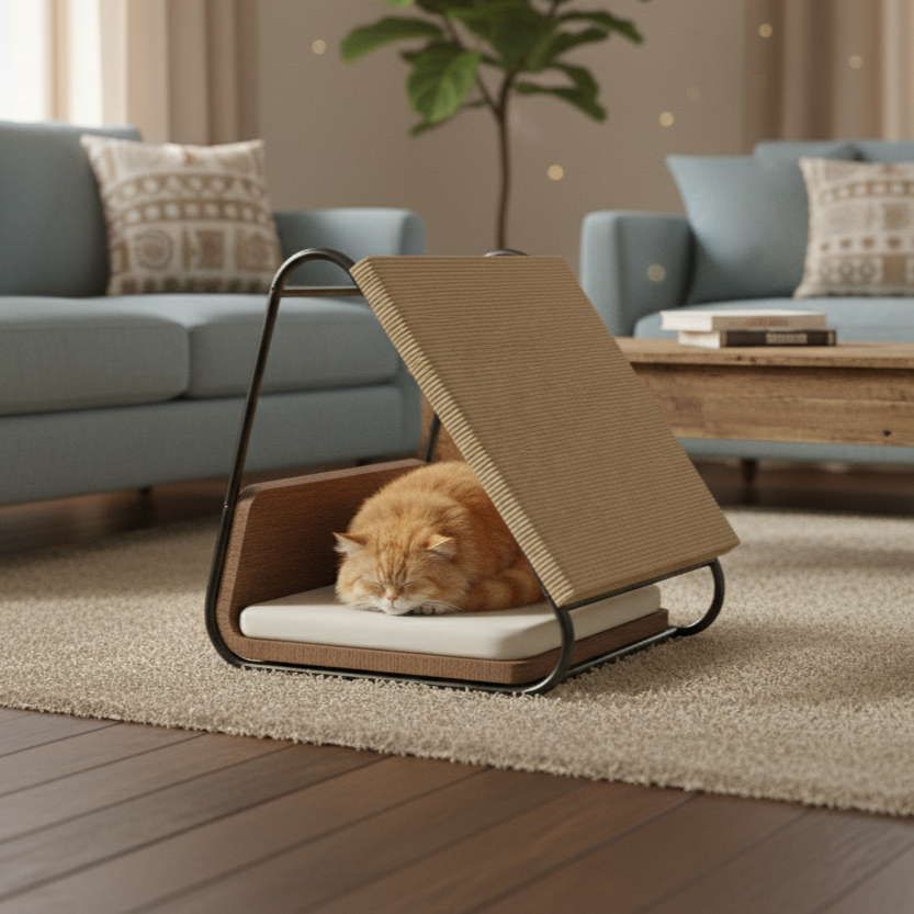 A modern triangular cat furniture piece crafted with a sturdy 12mm steel frame. One side features a scratch pad for your cat’s play and claw care, while the base is designed with a smoothly bent wooden platform, topped with a soft cushion for ultimate comfort.