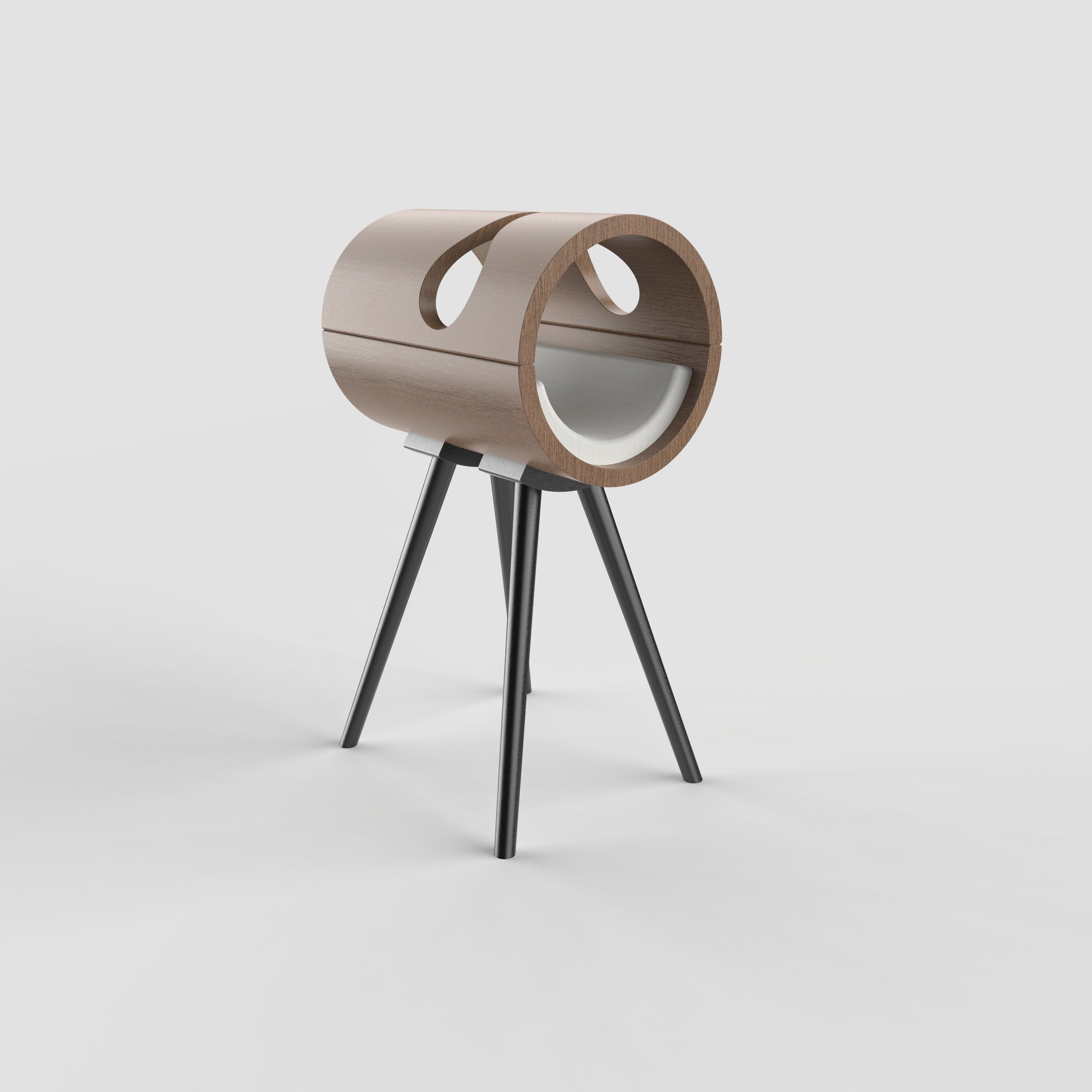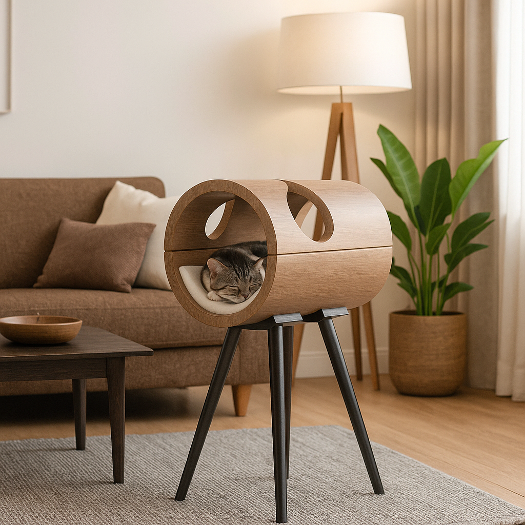 Crafted with curved wood and slender metal legs, Astara features a bold, sculptural form that gives cats a private sanctuary and adds character to refined interiors.