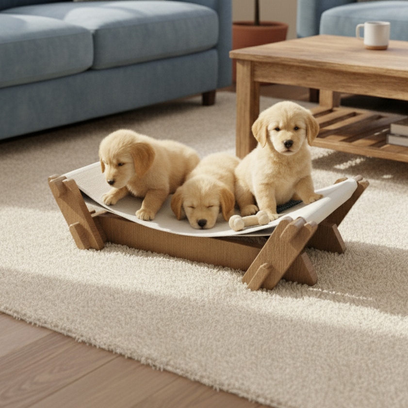 Orlo is a playful hammock designed especially for puppies. The suspended fabric gently cradles the body, creating a soft and elevated resting spot that feels both cozy and fun. Supported by a crafted wooden frame, Orlo introduces a sense of lightness and movement into rest time, blending function with a warm, contemporary design.
