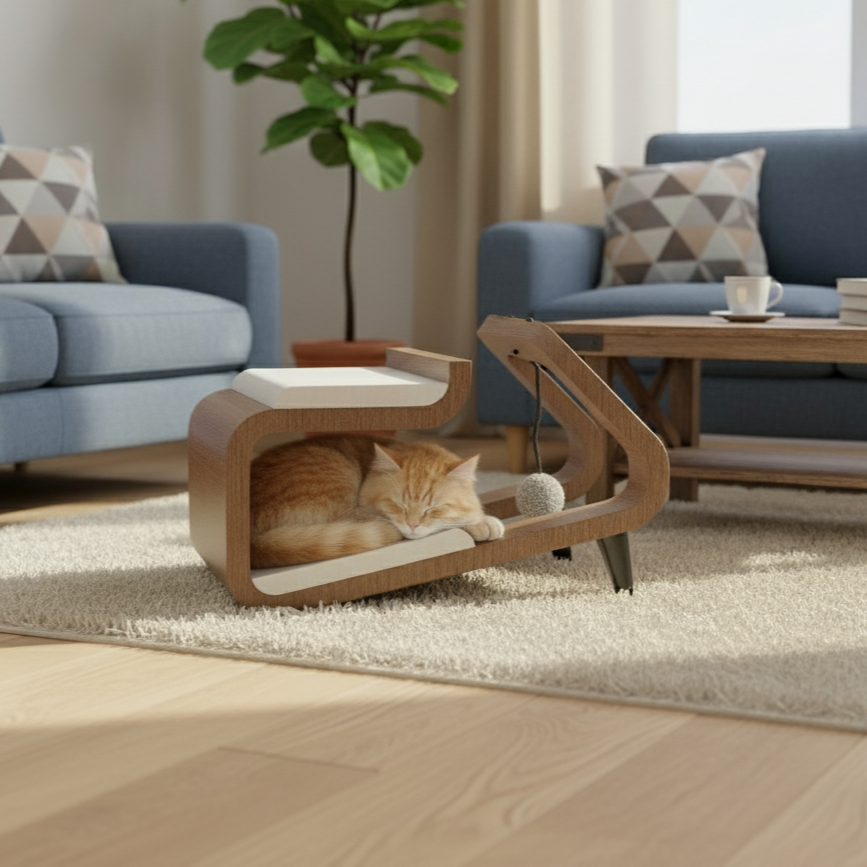 Wiska is a sculptural pet staircase that doubles as a play and rest station. Its flowing wooden frame holds softly cushioned steps, allowing small pets to climb with ease while offering inviting spots to lounge along the way. A playful hanging toy adds interaction, making Wiska more than just a functional aid it becomes part of a pet’s daily adventure while blending seamlessly into contemporary interiors.